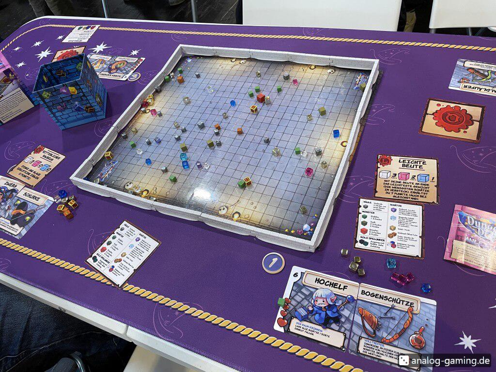 The dungeon “walls”, the monsters and the treasures are all small colored cubes. You build the “board” by dropping all of them on the table, and a game round consists of dropping some more cubes, “defining” a triangle between three cubes of a special type (called “pillar”) and looting all cubes in that triangle.