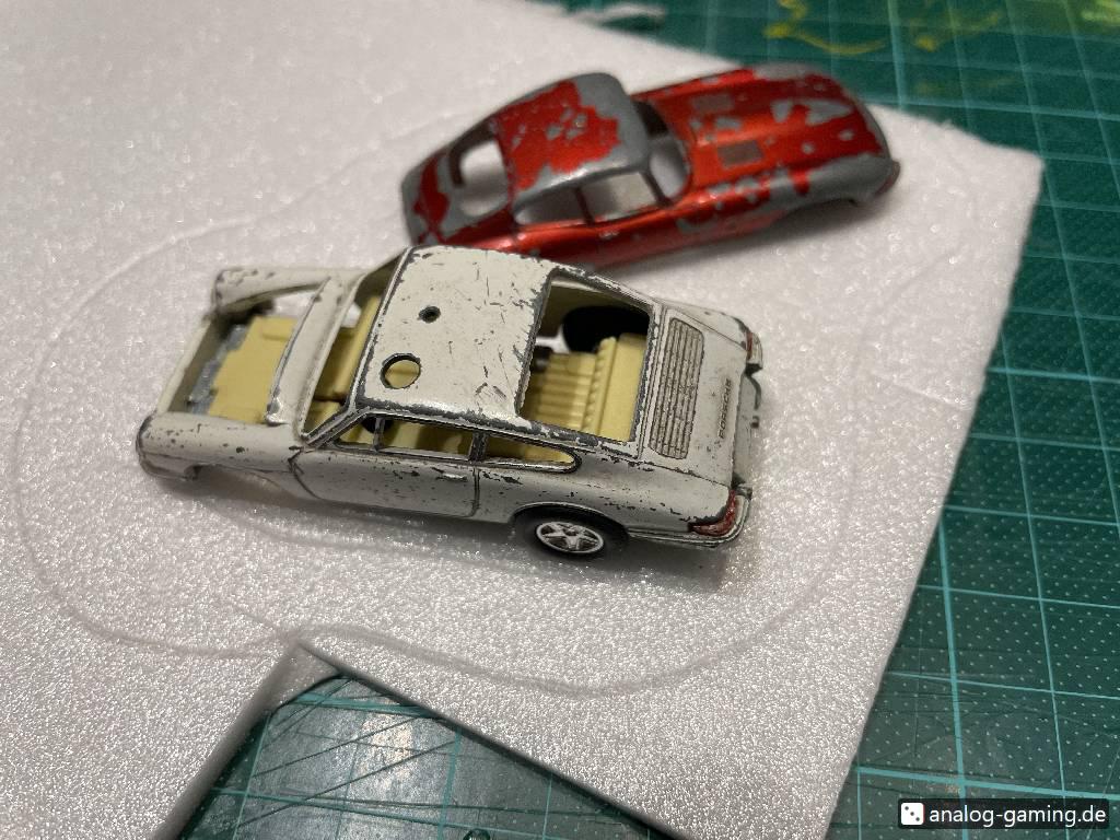 None of them had wheels (the wheels on the white car were actually taken from another model and are a bit too large). The white car didn’t have a hood either, that’s why it’s filled with sand where the engine should be.