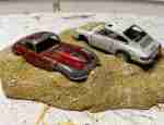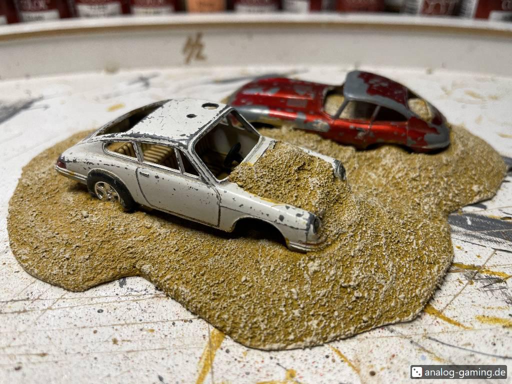 Another terrain piece for playing Gaslands on my desert board: some wrecked cars half-buried in sand.