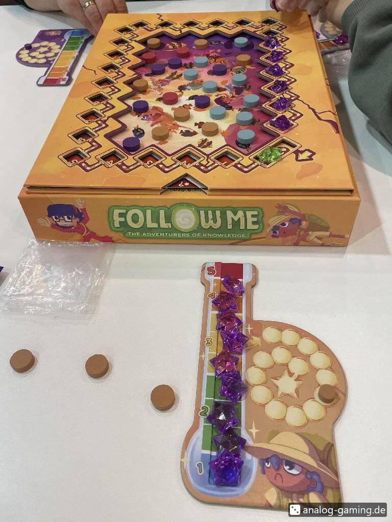 The game board consists of a fixed track on the outside and a big picture in the middle…and many different “inlays” (sheets of paper), so the picture on the inside and the values on the outside track can be replaced.