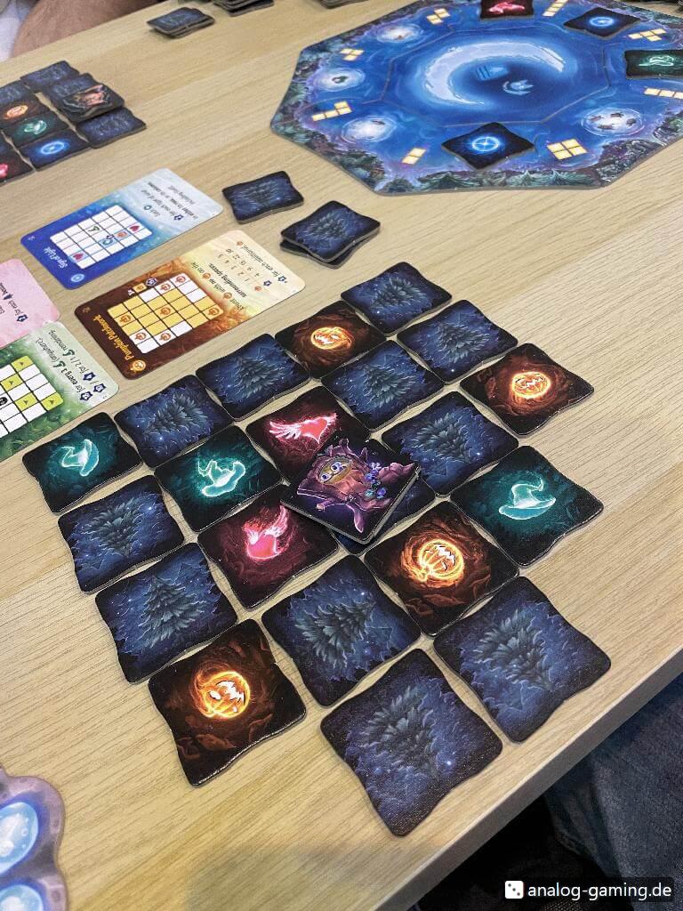 In your turn, you pick one of eight wisp tiles from a central board. Between every two tiles there is an image of a shape that looks like a Tetris piece. You pick one of the two shapes next to “your” tile, and take enough tree tiles so you can build that Tetris shape out of your wisp tile and the tree tiles. Then you have to place the shape in your player area, where you have to build a 4x4 grid with these shapes.