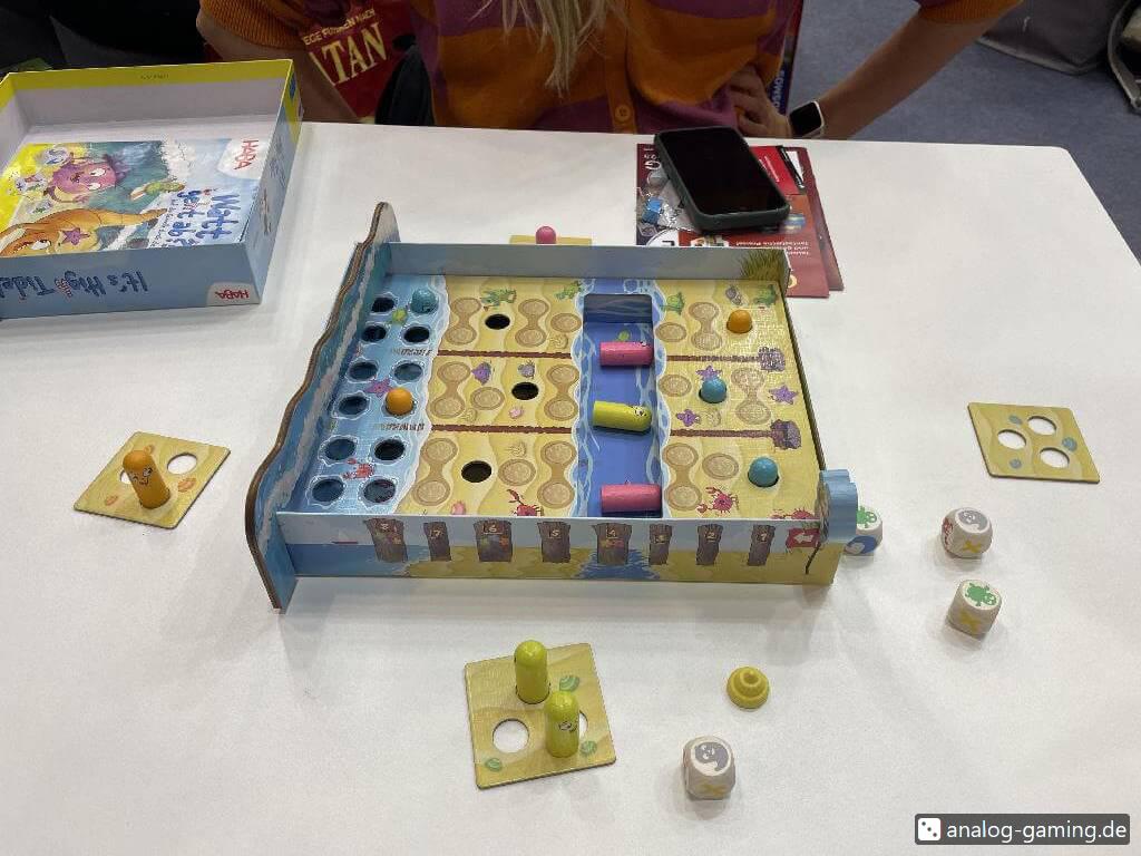 I went to the HABA booth to check out Point of View (see below). There was a demo table with that game, and people just sitting down with one free seat. I asked the group if I could join them, but it turns out that they had just occupied the table to check out It’s High Tide! for their kids. I joined them, and it’s really a nice kid’s game - a racing game where sandworms try to get from the beach to the sea by rolling dice.
