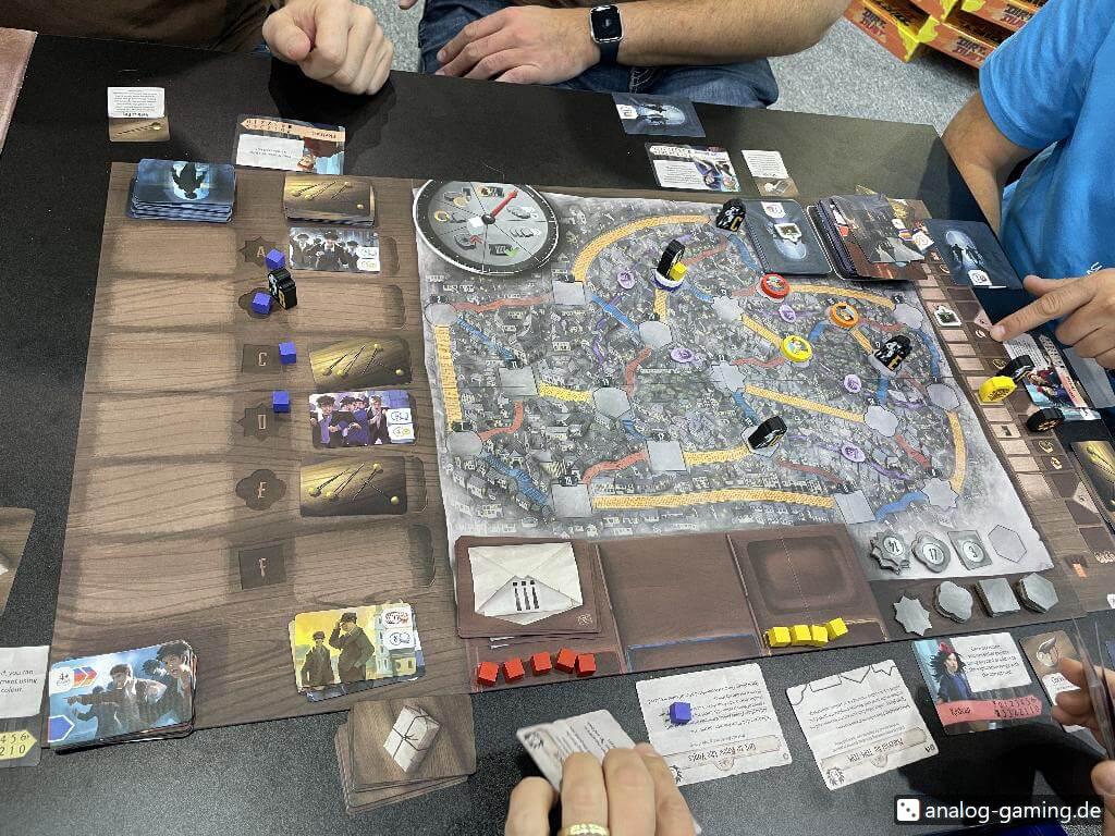 The game board is a city map with a number of locations, connected by lines in three different colors. To go to an adjacent location, you have to play a card matching the connection’s color. Interesting: other characters in the same location can basically say “I’ll follow you” and have to play any card. The Vont patrols move in a similar way, they draw cards that basically say “first go in the direction of the blue line, then the yellow line”.